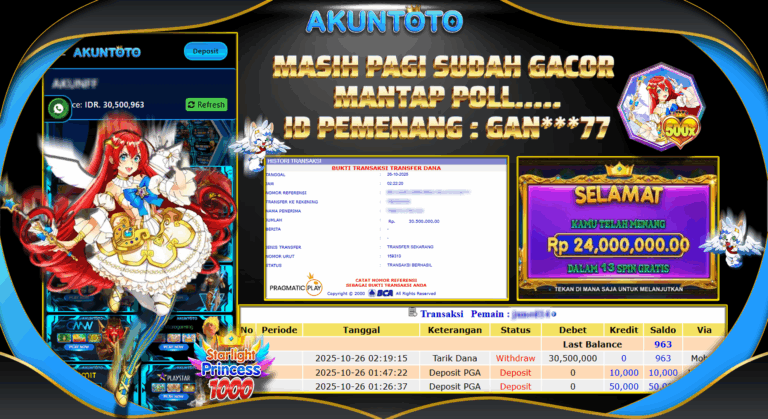 AKUNTOTO JACKPOT SLOT STRALIGHT PRINCES1000 Rp30.500.000 MINGGU 26 OKTOBER 2025 Selamat kepada User id GAN***77 : Telah berhasil mendapatkan kemenangan besar pada permainanSTRALIGHT PRINCES1000 5 – 10 menit pihak AKUNTOTO sudah melakukan transfer kepada pemilik User id dan dana sudah dapat di cairkan oleh pemenang. Bukti pembayaran yang kami berikan merupakan bukti pembayaran yang SAH…