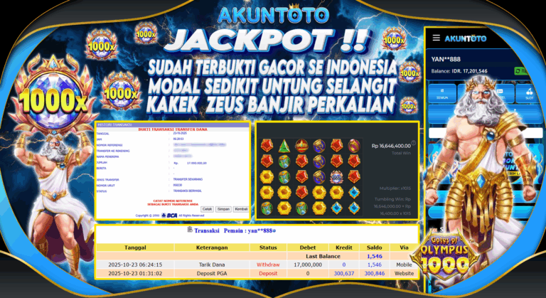 AKUNTOTO JACKPOT SLOT GATES OF OLYMPUS 1000 Rp 17.000.000 KAMIS 23 OKTOBER 2025 Selamat kepada User id YAN**888 : Telah berhasil mendapatkan kemenangan besar pada permainan SLOT GATES OF OLYMPUS 1000 5 – 10 menit pihak AKUNTOTO sudah melakukan transfer kepada pemilik User id dan dana sudah dapat di cairkan oleh pemenang. Bukti pembayaran yang…