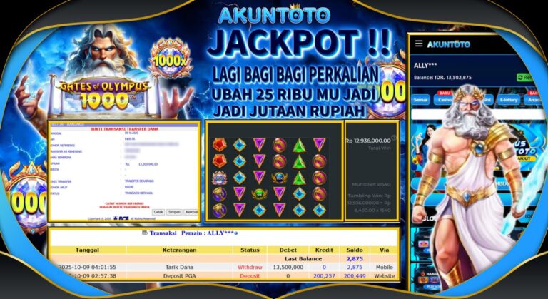 AKUNTOTO JACKPOT SLOT GATES OF OLYMPUS 1000 Rp 13.500.000 KAMIS 09 OKTOBER 2025 Selamat kepada User id : ALLY*** Telah berhasil mendapatkan kemenangan besar pada permainanGATES OF OLYMPUS 1000 5 – 10 menit pihak AKUNTOTO sudah melakukan transfer kepada pemilik User id dan dana sudah dapat di cairkan oleh pemenang. Bukti pembayaran yang kami berikan…