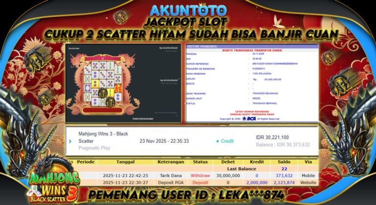 AKUNTOTO JACKPOT SLOT MAHJONG WINS 3 BLACK SCATTER Rp30.000.000 SENIN 24 NOVEMBER 2025 Selamat kepada User id LEKA***874 Telah berhasil mendapatkan kemenangan besar pada permainanMAHJONG WINS 3 BLACK SCATTER 5 – 10 menit pihak AKUNTOTO sudah melakukan transfer kepada pemilik User id dan dana sudah dapat di cairkan oleh pemenang. Bukti pembayaran yang kami berikan…